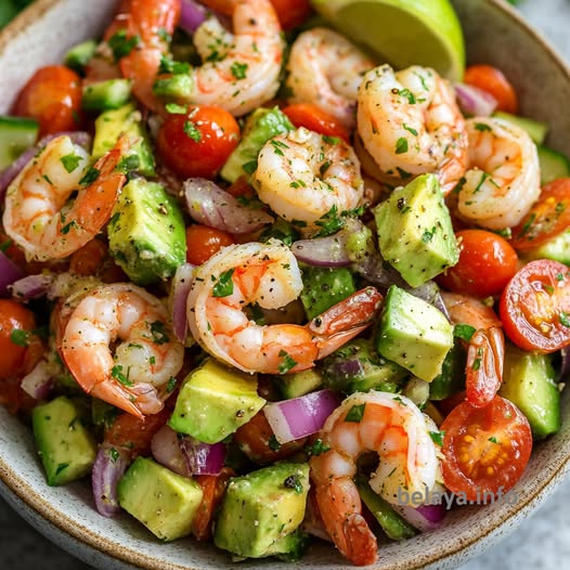Pour the dressing over the top of the Mexican shrimp salad and gently toss to combine.
